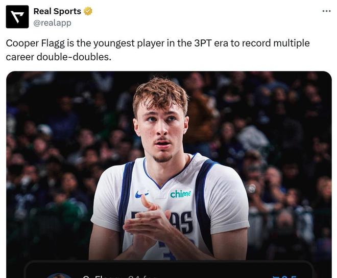 弗拉格本场11中6,拿下15分10篮板4助攻1盖帽两双数据,继超越詹姆斯成为NBA历史上最年轻两双先生后,又成为NBA引入三分线后多次拿到两双最年轻的球员。